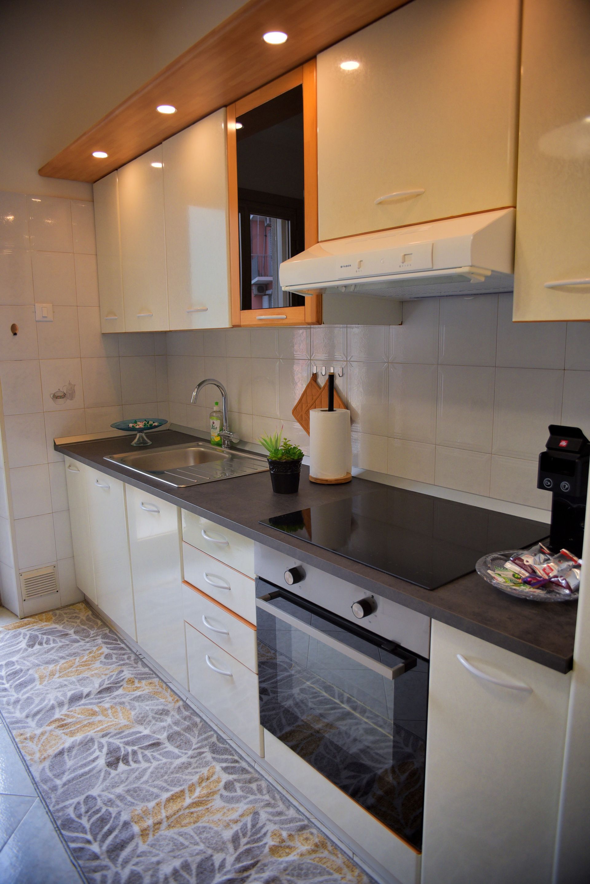 Une machine à café Illy de Trieste avec capsules, une bouilloire, un four électrique, un réfrigérateur, une plaque à induction et un ensemble de vaisselle et de couverts.
