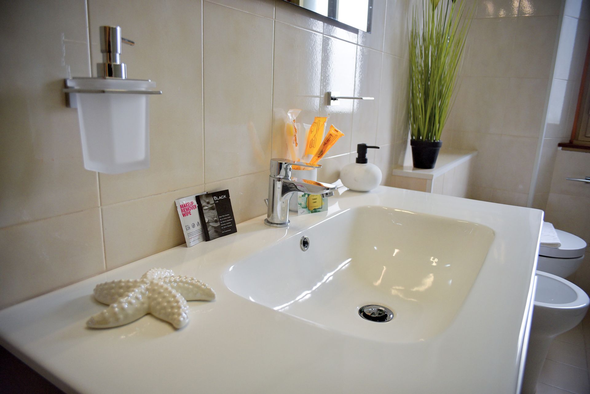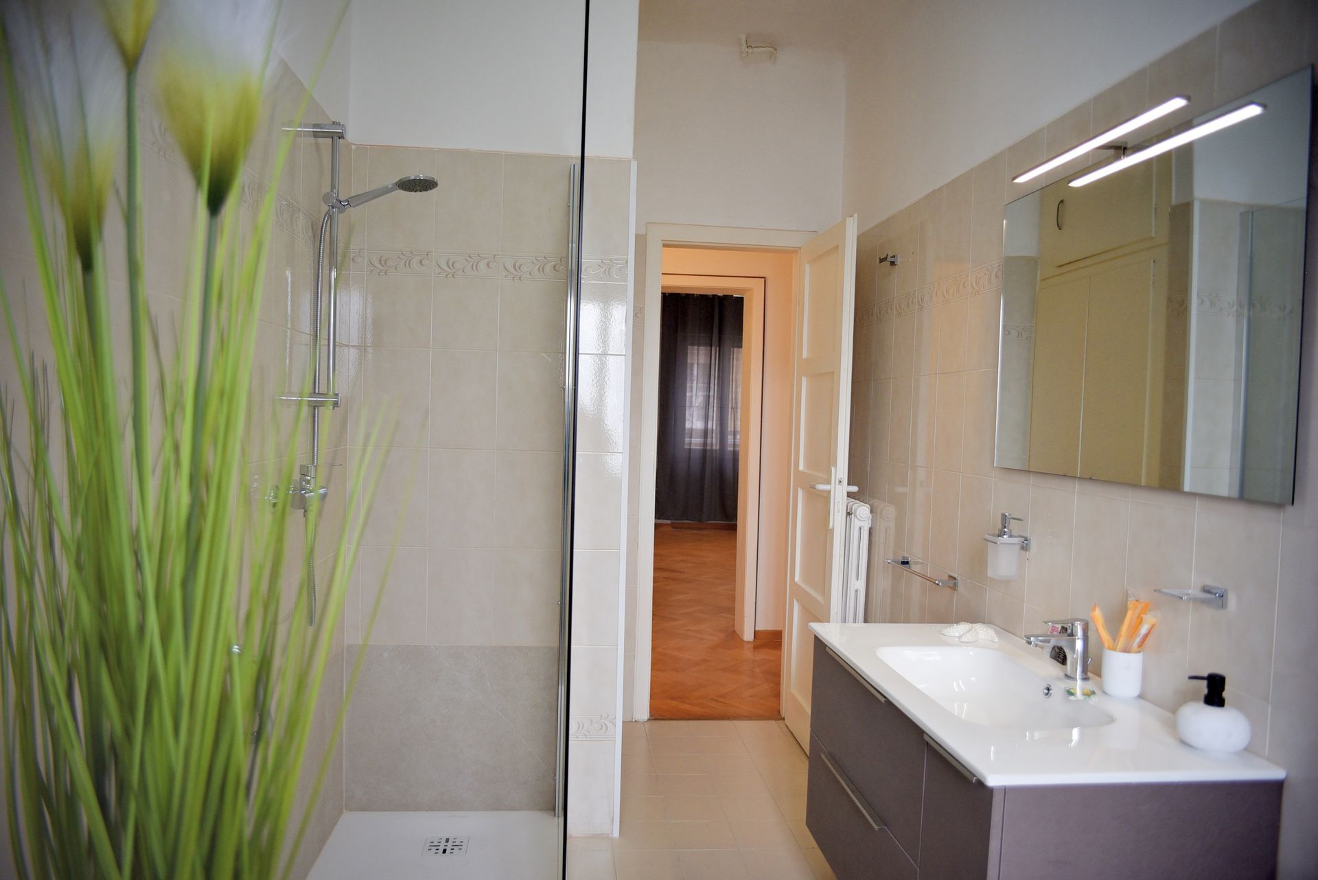 Dans la salle de bain avec douche à l'italienne, vous trouverez plusieurs distributeurs de savon pour les mains, ainsi qu'un lave-linge à votre usage exclusif.