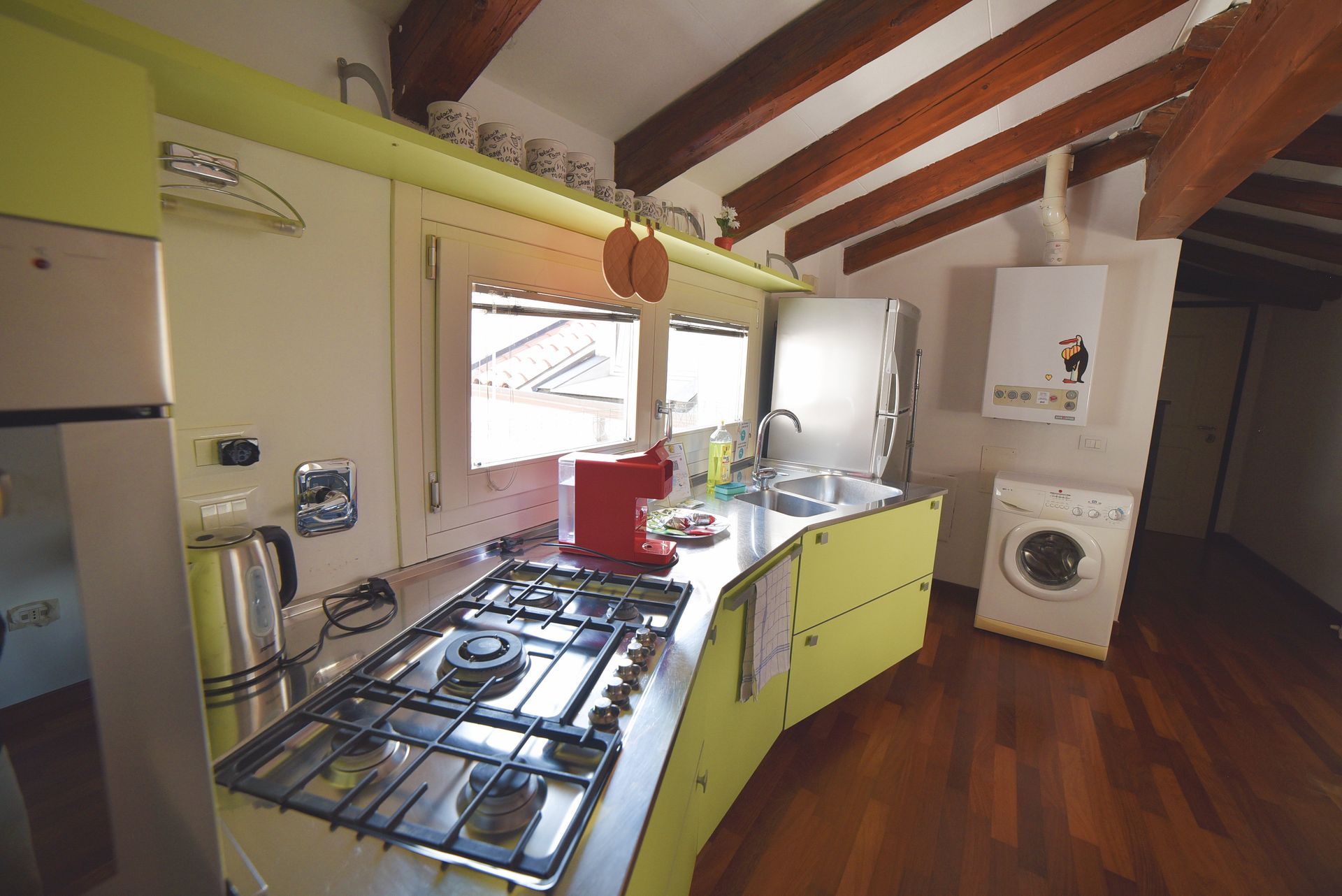 Una cucina attrezzata con tutto ciò di cui avrete bisogno, compresa lavatrice, forno, fornelli e vari utensili.