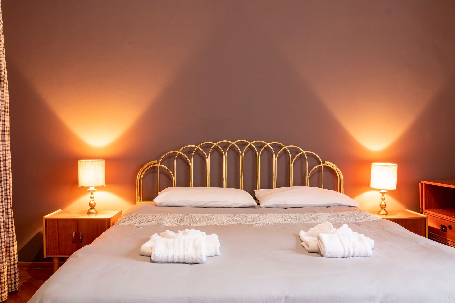 Pokój czteroosobowy z łóżkiem małżeńskim i dwoma pojedynczymi łóżkami na rozkładanej sofie.